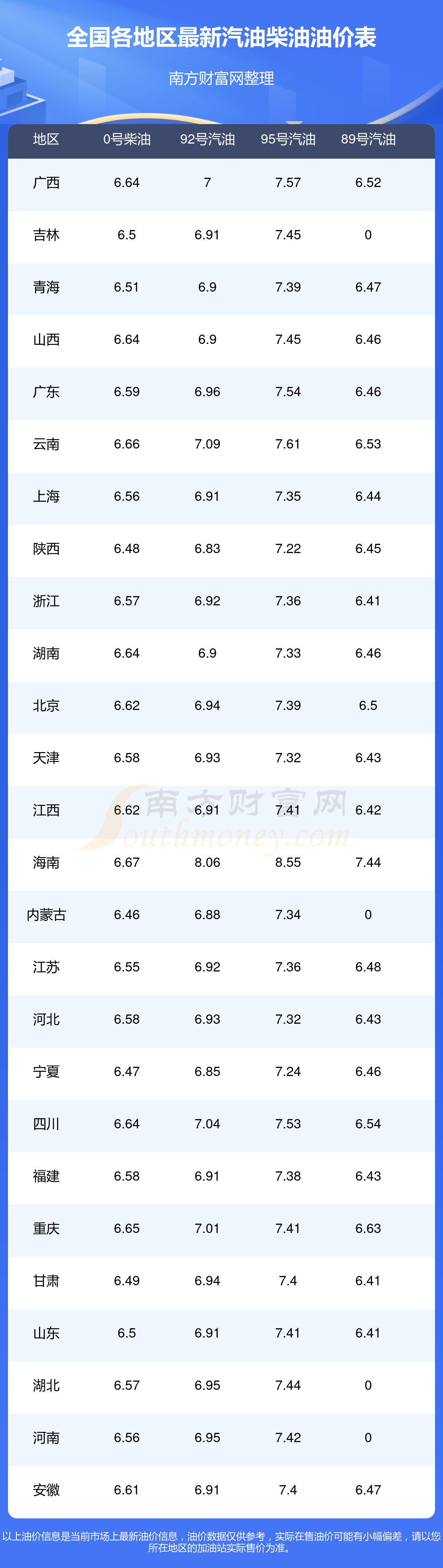 以上油价信息是当前市场上最新油价信息,油价数据仅供参考,实际在售油价可能有小幅偏差,请以您所在地区的加油站实际售价为准。
