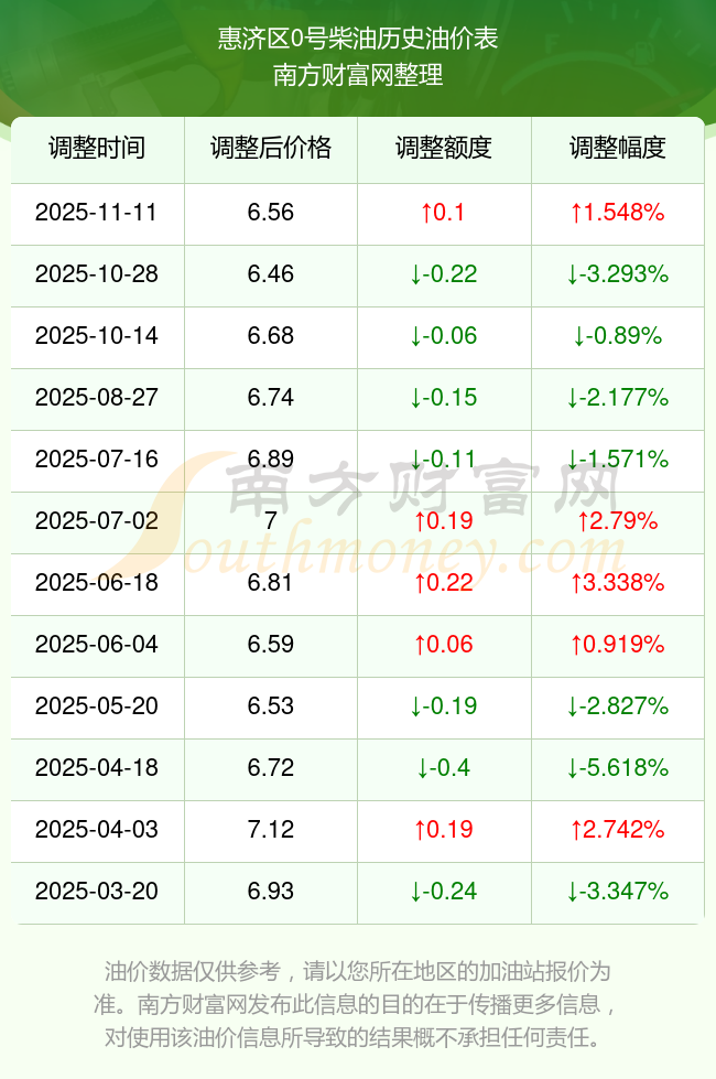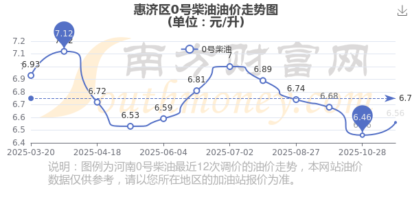惠济区0号柴油11月18日价格查询(11月11日油价调整后的价格):惠济区0号柴油6.56元/升,相对上次调整时间10月28日的油价6.46元每升,上涨了0.1元,上涨1.548%。