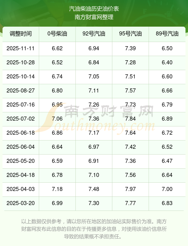 朝阳95号汽油11月18日最新价格为11月11日油价调整后的价格,具体为7.39元/升,相对上次调整时间10月28日的油价7.28元每升,共增了0.11元,增1.511%。下一轮油价调整时间11月24日24时,距离现在还有6.39天。