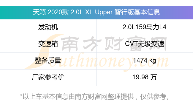 在动力上,天籁 2020款 2.0L XL Upper 智行版配备的是一台2.0L159马力L4自然吸气发动机,匹配的是CVT无级变速自动档变速箱,燃料形式为汽油,常规整备质量1474kg,厂家参考价19.98万元。