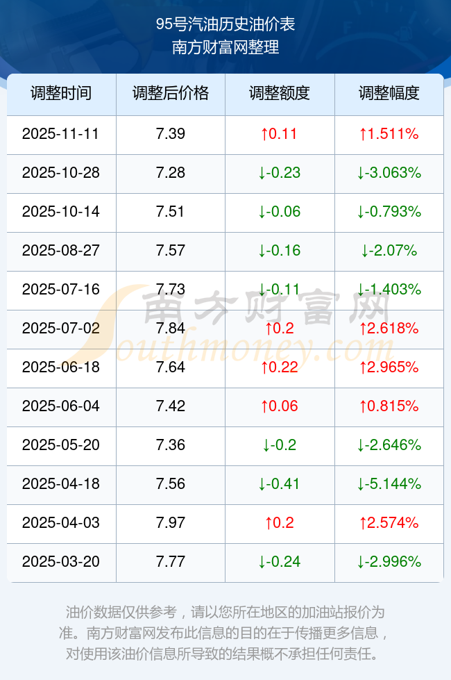 油价调整最新消息:下一轮油价调整时间11月24日24时。北京汽油、柴油11月18日每升最新价格为:调整时间为11月11日,92号汽油为6.94元,上涨了0.1元;95号汽油为7.39元,上涨了0.11元;89号汽油为6.5元,上涨了0.1;0号柴油为6.62元,上涨了0.1元。