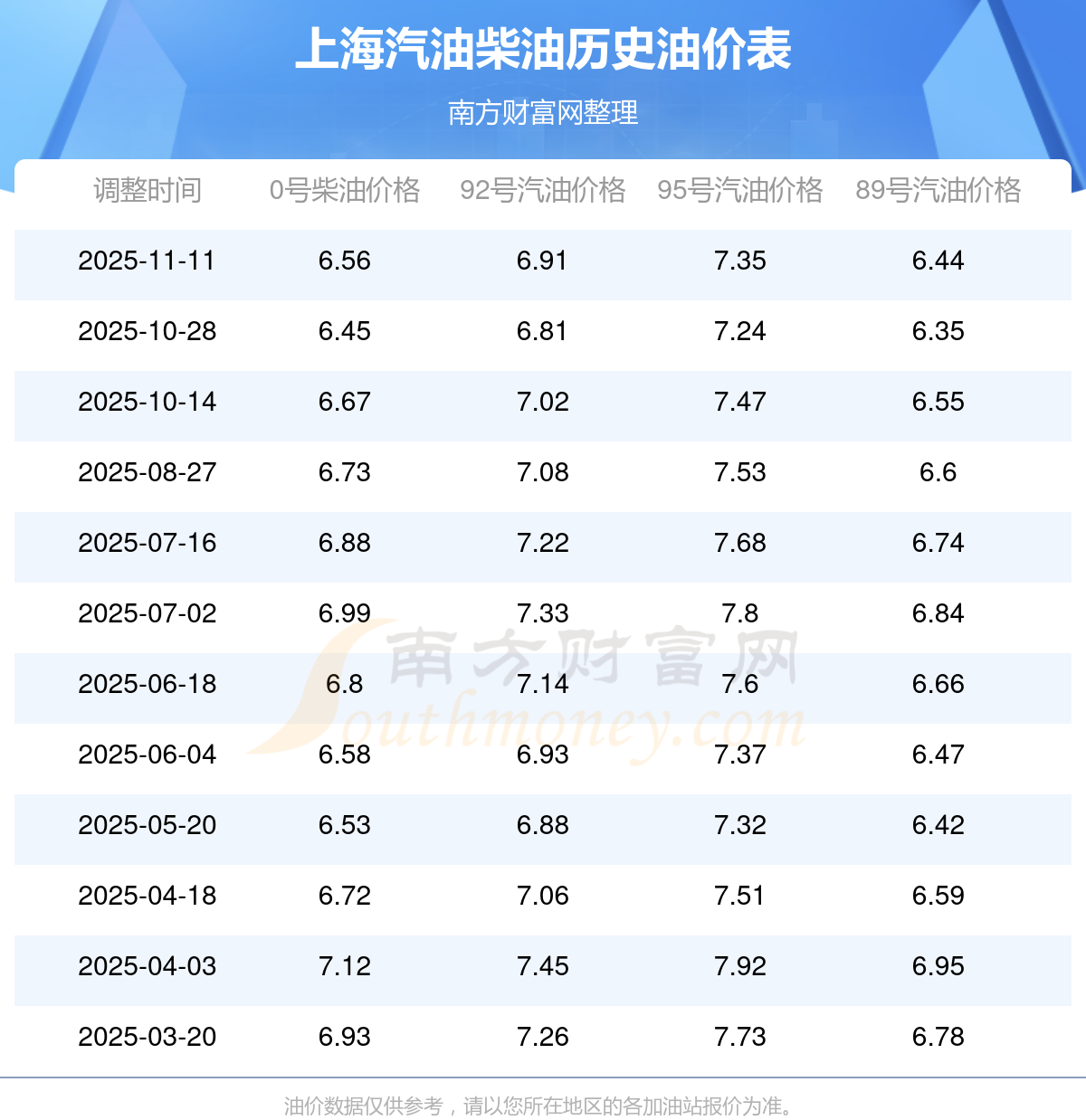 11月18日上海汽油、柴油每升价格:距离最近的油价调整时间是11月11日,92号汽油为6.91元,上调了0.1元,上调幅达1.47%;95号汽油为7.35元,上调了0.11元,上调幅达1.52%;89号汽油为6.44元,上调了0.09元,上调幅达1.42%;0号柴油为6.56元,上调了0.11元,上调幅达1.71%。