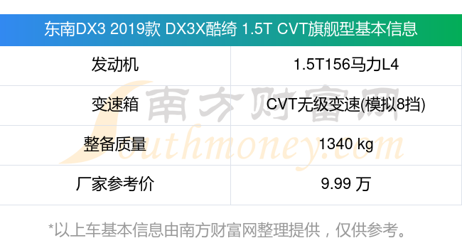 东南DX3 2019款 DX3X酷绮 1.5T CVT旗舰型搭载了一台1.5T156马力L4涡轮增压发动机,采用CVT无级变速(模拟8挡)自动档变速箱,常规整备质量1340kg,厂家参考价9.99万元。