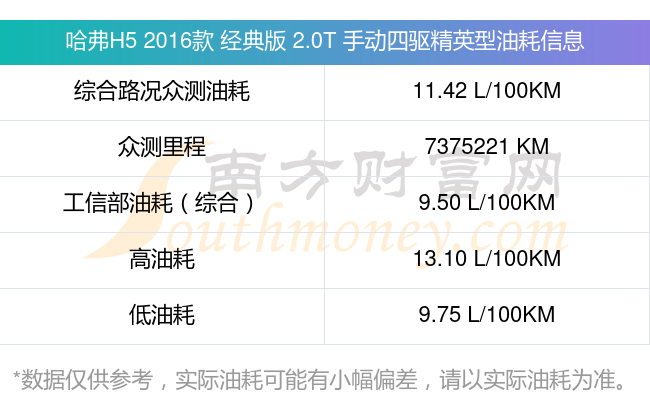 根据多位车主实测得出数据,该车型低油耗为9.75L/100km,高油耗为13.10L/100km,综合路况众测油耗为11.42L/100km,工信部综合油耗为9.50L/100km。