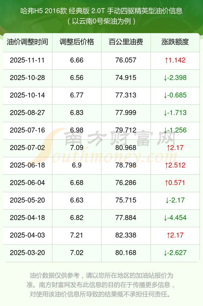 按照11月11日0号柴油最新调整价格6.66元/升来计算(以云南为例),该车型百公里平均油费为76.057元,按照上一轮10月28日调整价格6.56元/升来计算,百公里平均油费为74.915元,对比上一轮多花1.142元,下一轮油价调整时间为11月24日24时。