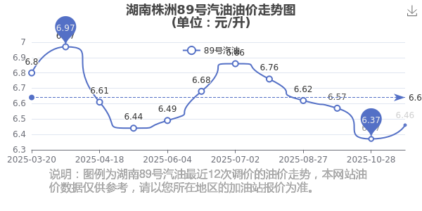 汽油、柴油11月18日每升的价格为(本轮油价调整时间为11月11日):92号汽油6.9元;95号汽油7.33元;89号汽油6.46元;0号柴油6.64元。