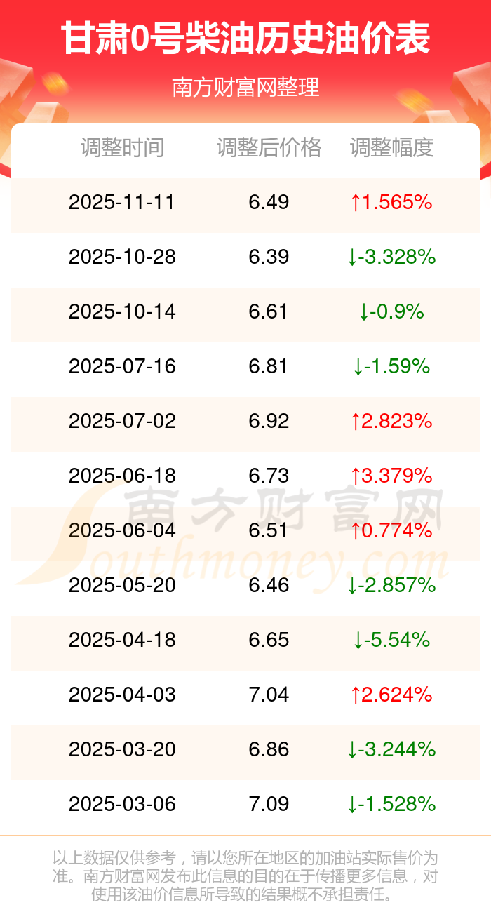 油价调整最新消息:甘肃汽油、柴油11月18日每升最新价格查询:本轮油价调整时间为11月11日,92号汽油6.94元,涨了0.11元;95号汽油7.4元,涨了0.1元;89号汽油6.41元,涨了0.09;0号柴油6.49元,涨了0.1元。下一轮油价调整时间11月24日24时。