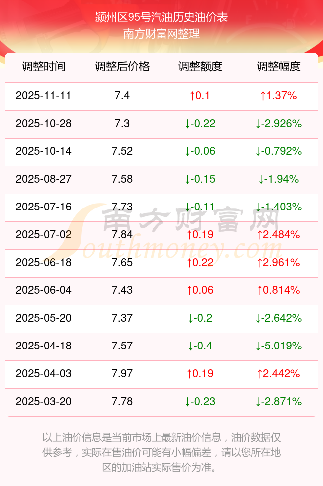 11月18日颍州区汽油、柴油价格是11月11日调整后的价格,每升价格具体为:92号汽油为6.91元,升了0.1元,升幅达1.47%;95号汽油为7.4元,升了0.1元,升幅达1.37%;89号汽油为6.47元,升了0.1元,升幅达1.57%;0号柴油为6.61元,升了0.1元,升幅达1.54%。