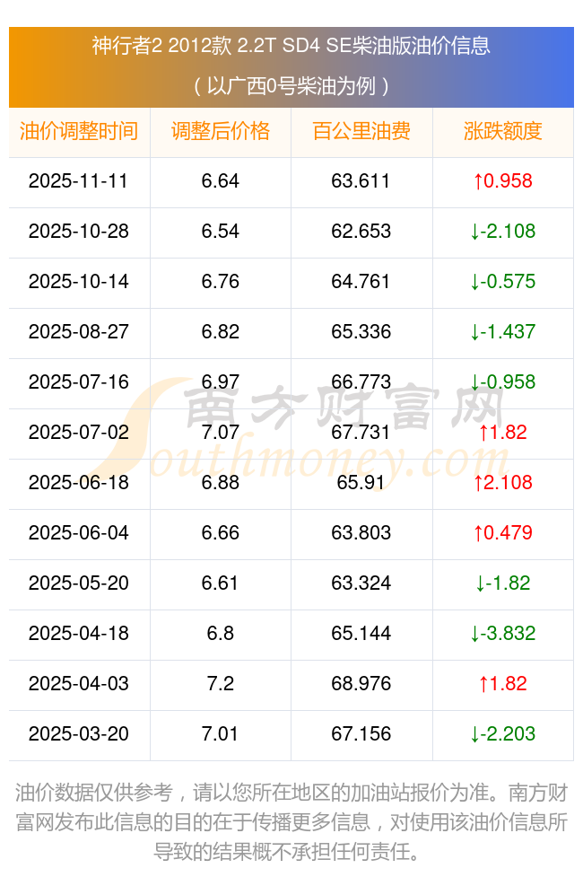 按11月11日0号柴油最新调整价格6.64元每升来计算(以广西为例),该车型百公里平均油费为63.611元,按上一轮10月28日调整价格6.54元每升来计算,百公里平均油费为62.653元,对比上一轮多花0.958元,下一轮油价调整时间为11月24日24时。