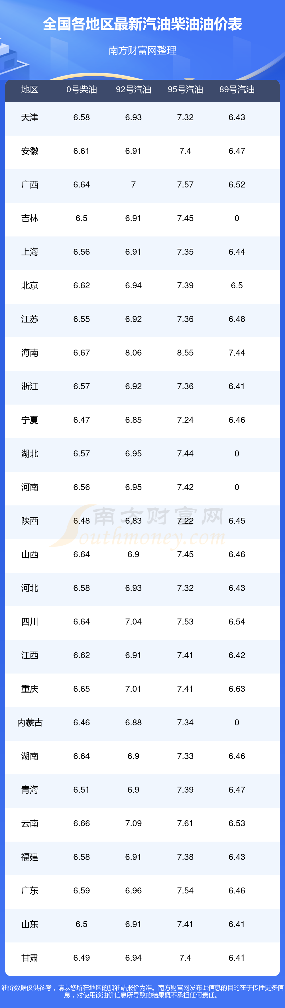 以上数据仅供参考,请以您所在地区的加油站实际售价为准。开云手机web版登录入口发布此信息的目的在于传播更多信息,对使用该油价信息所导致的结果概不承担责任。