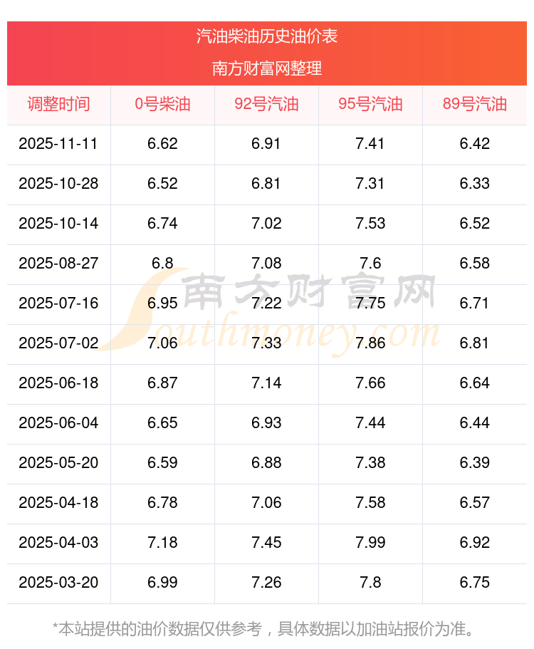 2025年汽油柴油油价调整一览表