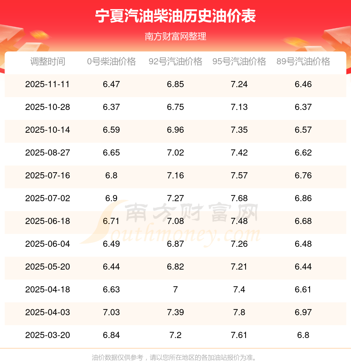 宁夏汽油、柴油11月18日每升最新价格为11月11日调整后的价格,92号汽油为6.85元,涨了0.1元;95号汽油为7.24元,涨了0.11元;89号汽油为6.46元,涨了0.09;0号柴油为6.47元,涨了0.1元。