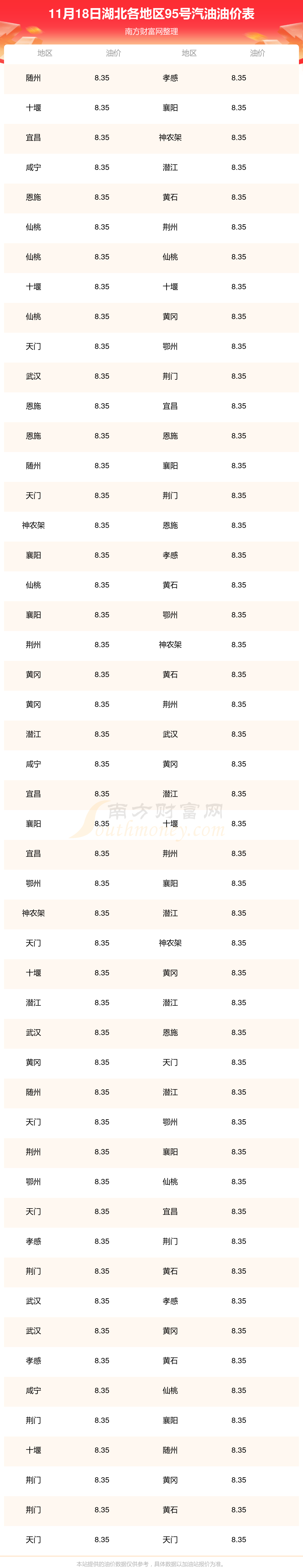 2025年11月18日湖北95号汽油最新价格一览表