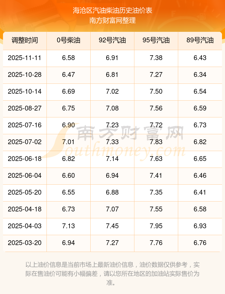 油价调整最新消息:下一轮油价调整时间11月24日24时。11月18日,海沧区汽油、柴油每升的价格为11月11日调整后的价格,具体为:92号汽油为6.91元,升了0.1元,升幅达1.47%;95号汽油为7.38元,升了0.11元,升幅达1.51%;89号汽油为6.43元,升了0.09元,升幅达1.42%;0号柴油为6.58元,升了0.11元,升幅达1.7%。