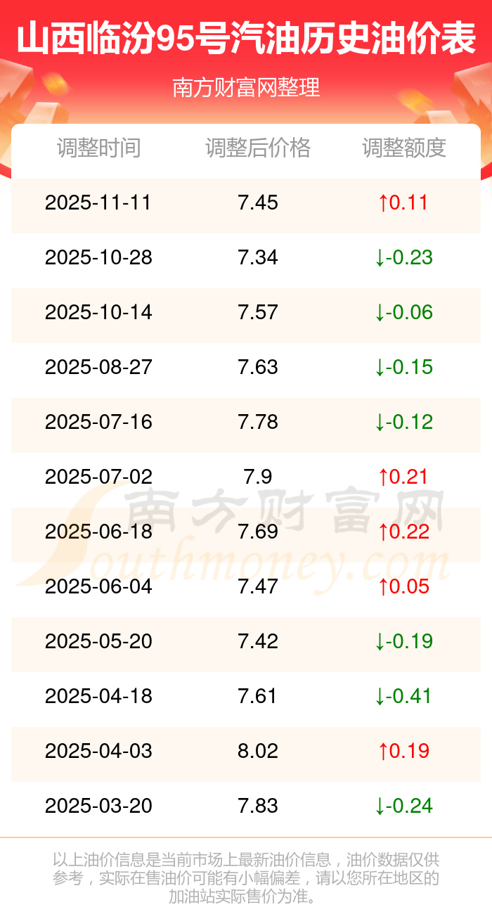 11月18日山西临汾95号汽油价格:7.45元每升,调整时间为11月11日,相对上次调整升了0.11元。下一轮油价调整时间11月24日24时,距离现在还有6.29天。