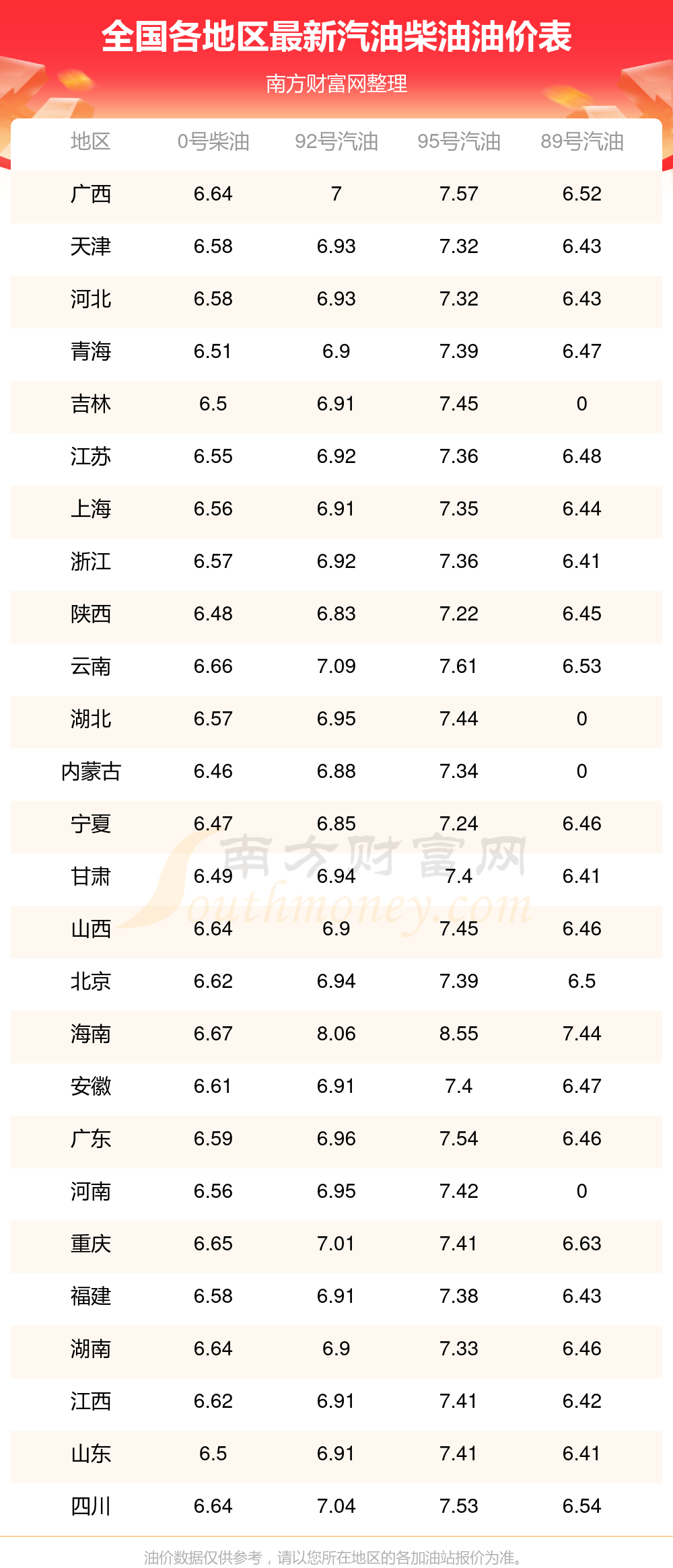 以上油价信息是当前市场上最新油价信息,油价数据仅供参考,实际在售油价可能有小幅偏差,请以您所在地区的加油站实际售价为准。