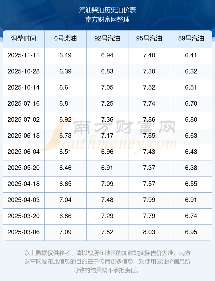 11月18日张掖92号汽油的最新价格(11月11日调整后的价格):6.94元/升,相对上次调整上升了0.11元。下一轮油价调整时间11月24日24时,距离现在还有6.28天。