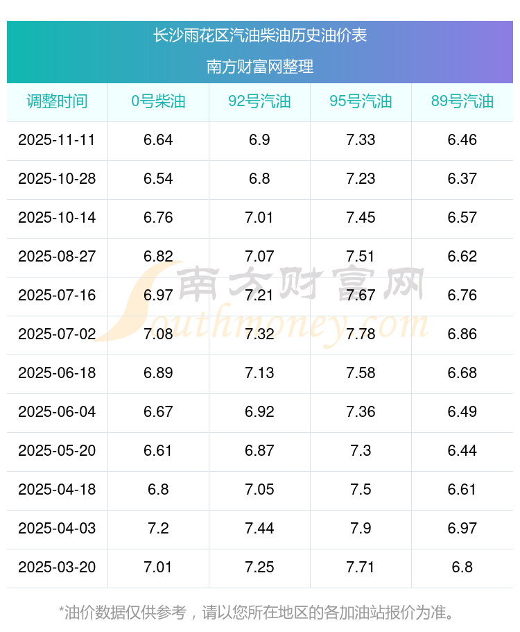 11月18日长沙雨花区汽油、柴油价格是11月11日调整后的价格,每升价格具体为:92号汽油为6.9元,上涨了0.1元,上涨幅达1.46%;95号汽油为7.33元,上涨了0.11元,上涨幅达1.46%;89号汽油为6.46元,上涨了0.09元,上涨幅达1.46%;0号柴油为6.64元,上涨了0.1元,上涨幅达1.58%。