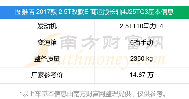 图雅诺 2017款 2.5T改款E 商运版长轴4J25TC3动力上搭载的是一台2.5T110马力L4涡轮增压发动机,匹配6挡手动挡变速箱,燃料形式为柴油,常规整备质量2350kg,厂家参考价14.67万元。