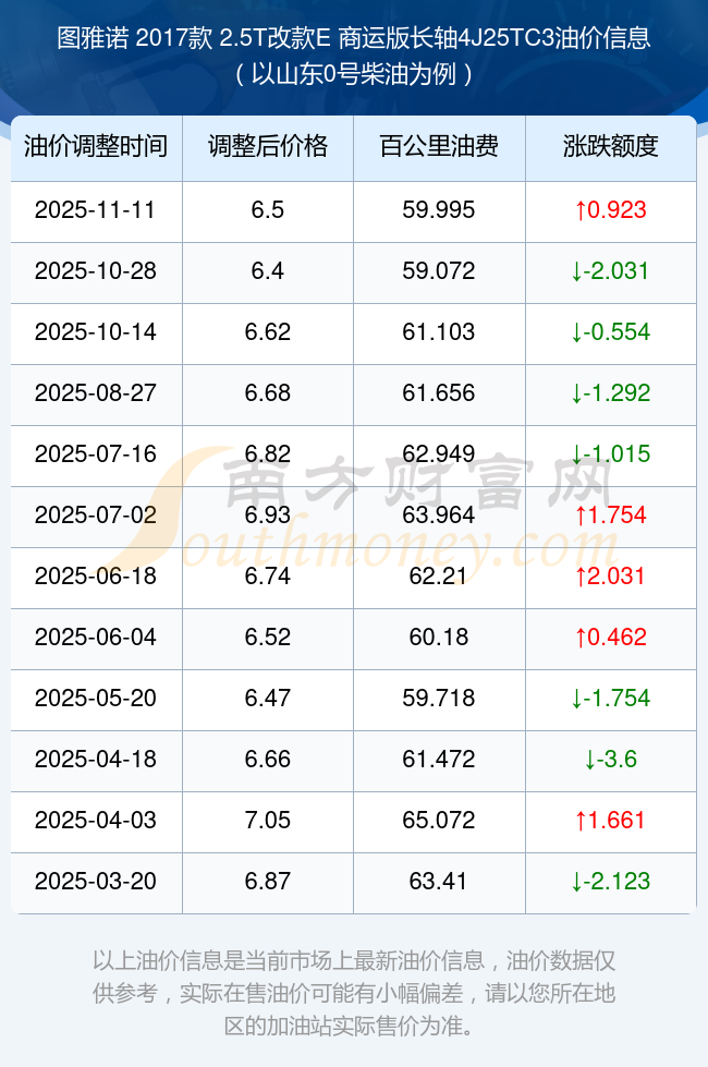 按照11月11日0号柴油最新调整价格6.5元/升来计算(以山东为例),该车型百公里平均油费为59.995元,按照上一轮10月28日调整价格6.4元/升来计算,百公里平均油费为59.072元,对比上一轮多花0.923元,下一轮油价调整时间为11月24日24时。