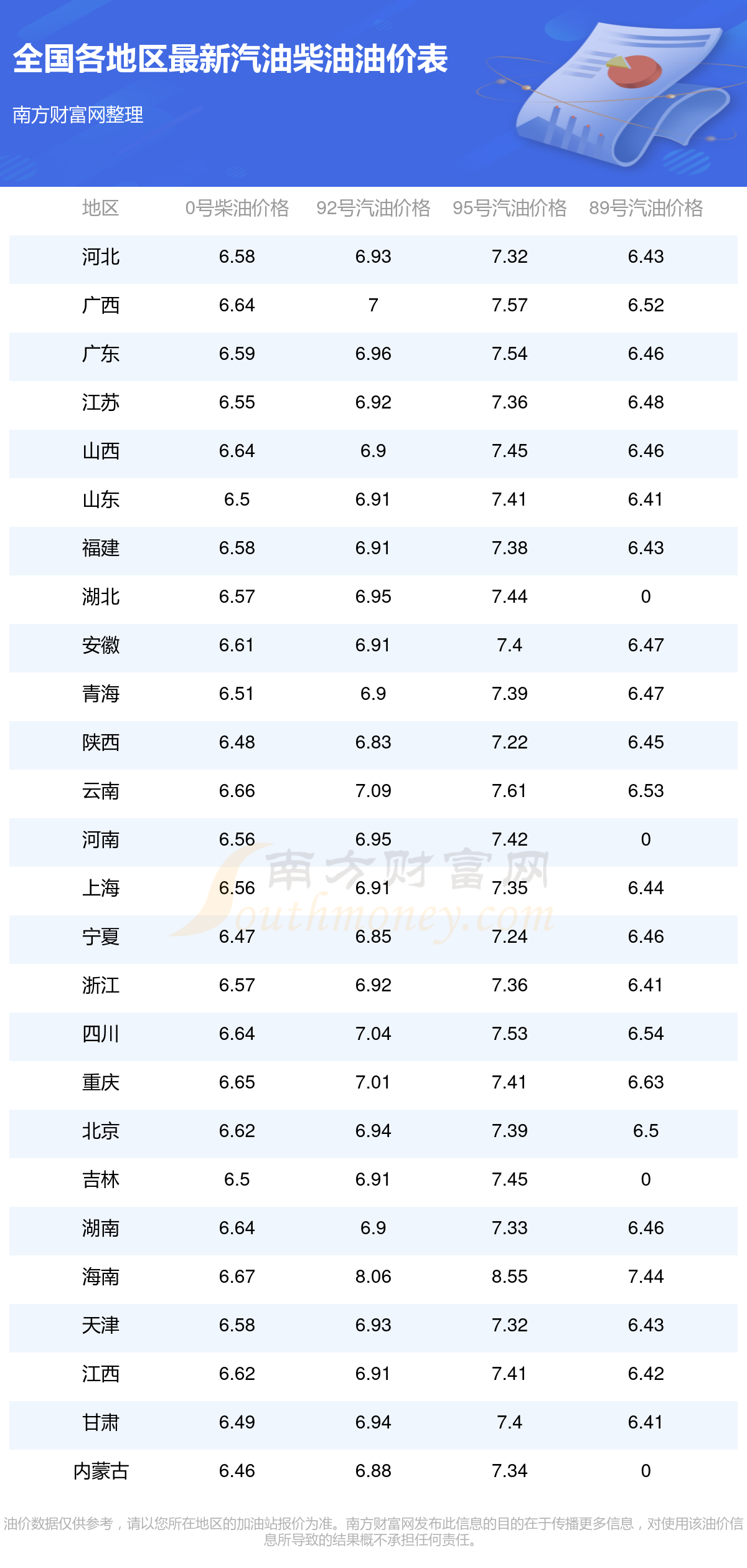 2025年11月18日全国各地油价调整及最新汽油价格表