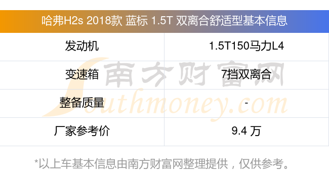 哈弗H2s 2018款 蓝标 1.5T 双离合舒适型动力上配备的是一台1.5T150马力L4涡轮增压发动机,匹配的是7挡双离合自动档变速箱,燃料形式为汽油,厂家参考价9.4万元。