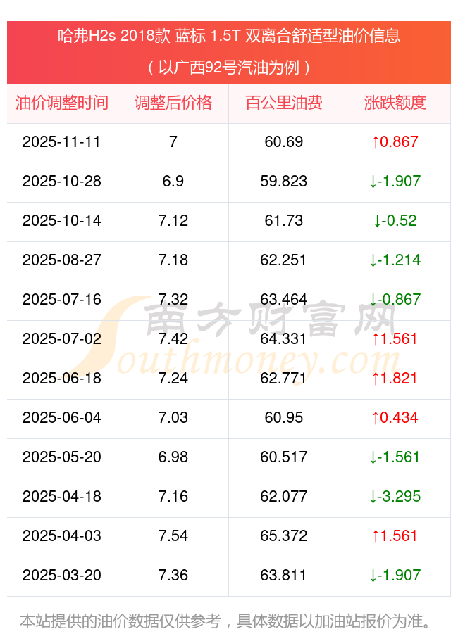 依照11月11日92号汽油最新调整价格7元/升来计算(以广西为例),该车型百公里的平均油费是60.69元,依照上一轮10月28日调整价格6.9元/升来计算,百公里的平均油费是59.823元,对比上一轮多花0.867元,下一轮的油价调整时间11月24日24时。