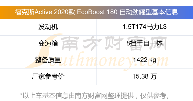 福克斯Active 2020款 EcoBoost 180 自动劲??型动力上配备的是一台1.5T174马力L3涡轮增压发动机,匹配的是8挡手自一体自动档变速箱,燃料形式为汽油,常规整备质量1422kg,厂家参考价15.38万元。