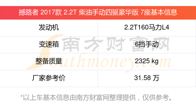 撼路者 2017款 2.2T 柴油手动四驱豪华版 7座搭载了一台2.2T160马力L4涡轮增压发动机,采用6挡手动挡变速箱,常规整备质量2325kg,厂家参考价31.58万元。
