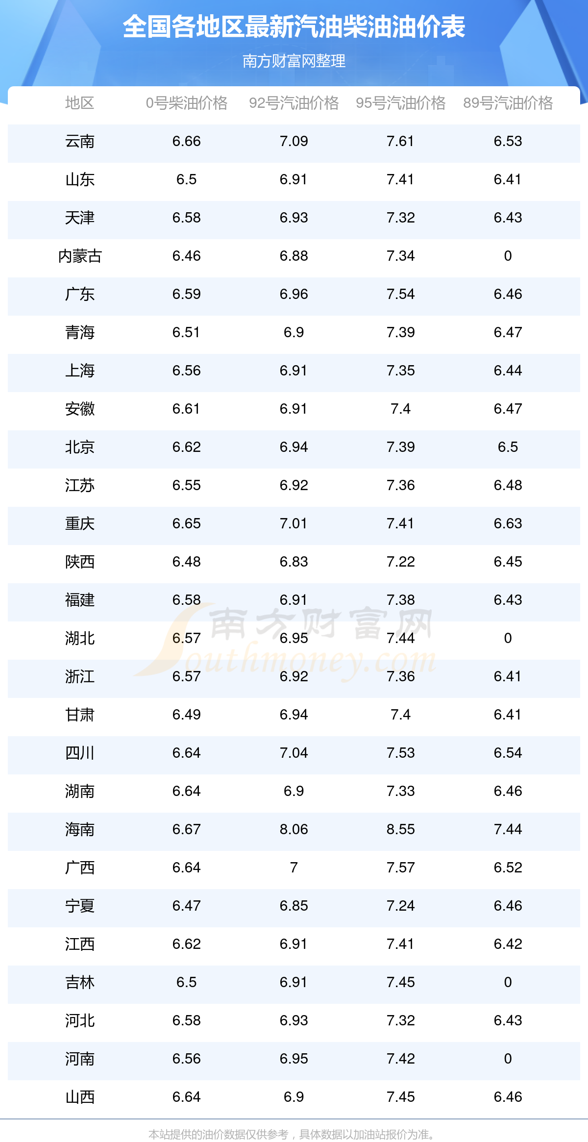 以上数据仅供参考,请以您所在地区的加油站实际售价为准。开云手机web版登录入口发布此信息的目的在于传播更多信息,对使用该油价信息所导致的结果概不承担责任。