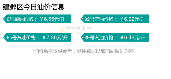 建邺区汽油、柴油11月18日每升最新价格为:92号汽油为6.92元;95号汽油为7.36元;89号汽油为6.48元;0号柴油为6.55元,调整时间为11月11日。下一轮油价调整时间11月24日24时。