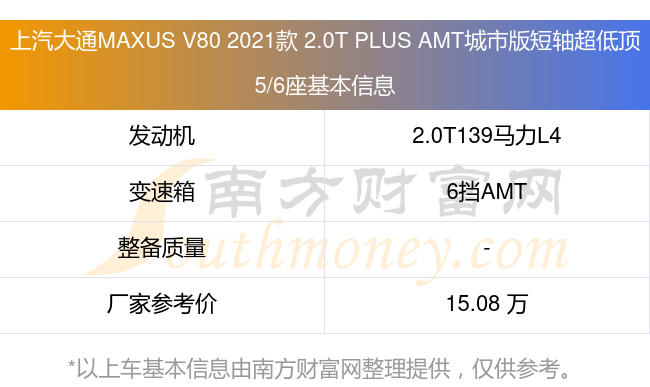 在动力上,上汽大通MAXUS V80 2021款 2.0T PLUS AMT城市版短轴超低顶5/6座配备的是一台2.0T139马力L4涡轮增压发动机,匹配的是6挡AMT自动档变速箱,燃料形式为柴油,厂家参考价15.08万元。
