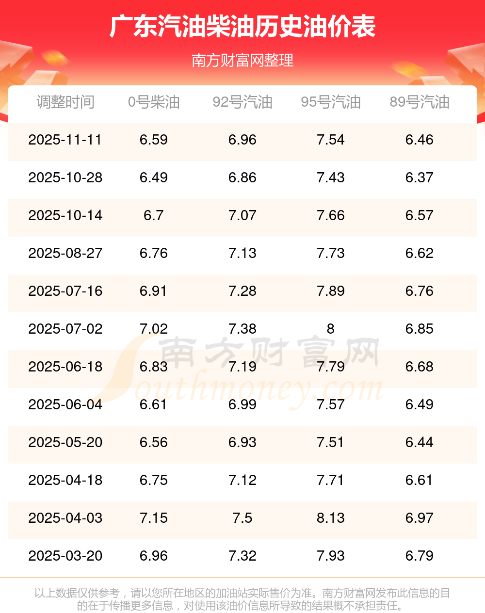 汽油价格调整最新消息:下一轮油价调整时间11月24日24时。11月18日,广东汽油、柴油的价格为11月11日调整后的价格。具体为:92号汽油6.96元,升了0.1元;95号汽油7.54元,升了0.11元;89号汽油6.46元,升了0.09;0号柴油6.59元,升了0.1元。