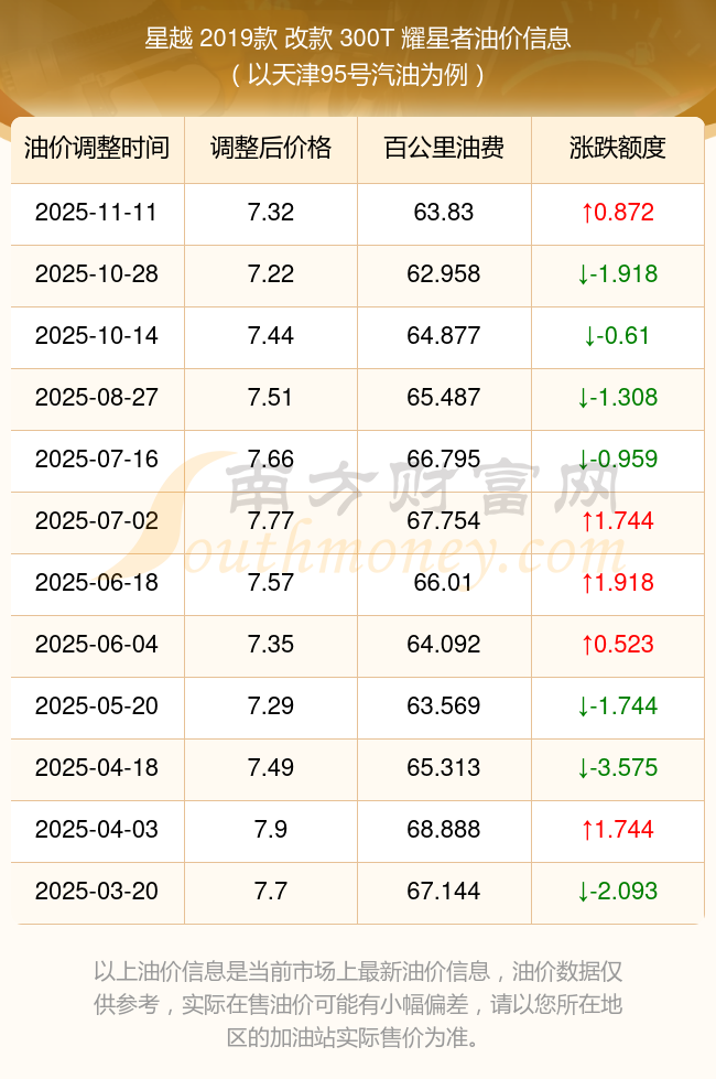 依照11月11日95号汽油最新调整价格7.32元/升来计算(以天津为例),该车型百公里的平均油费是63.83元,依照上一轮10月28日调整价格7.22元/升来计算,百公里的平均油费是62.958元,对比上一轮多花0.872元,下一轮的油价调整时间11月24日24时。