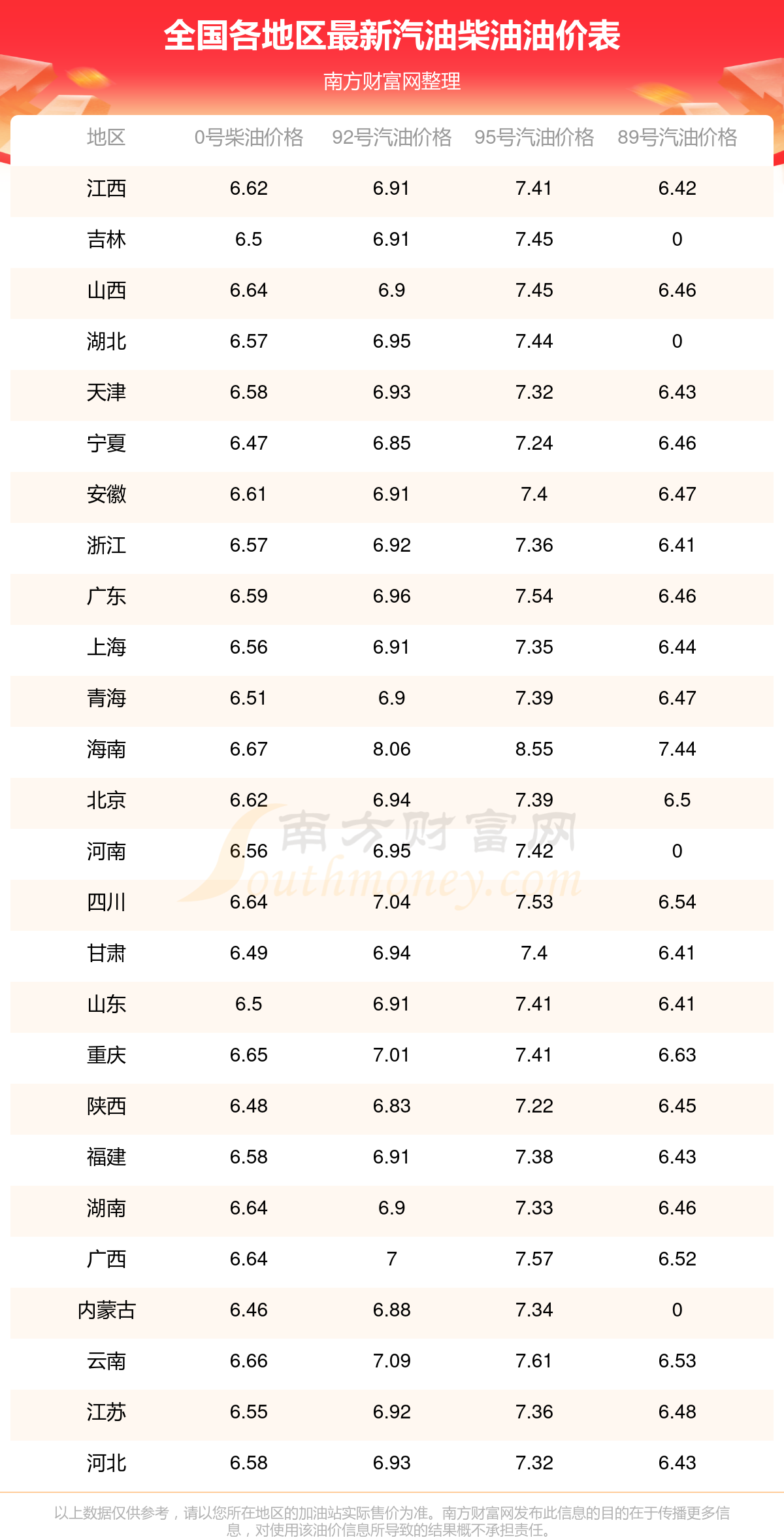 全国各地区最新油价表