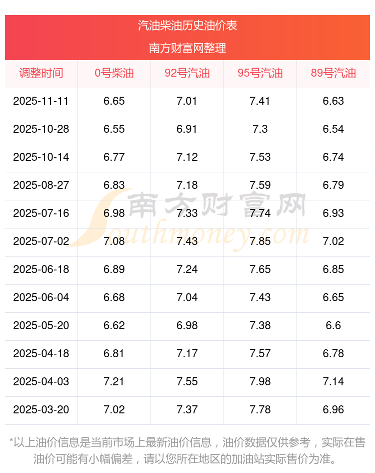 重庆奉节92号汽油11月18日最新价格为7.01元/升,调整时间为11月11日,相对上次调整时间10月28日的油价6.91元每升,增了0.1元,增1.447%。下一轮油价调整时间11月24日24时,距离现在还有6.22天。