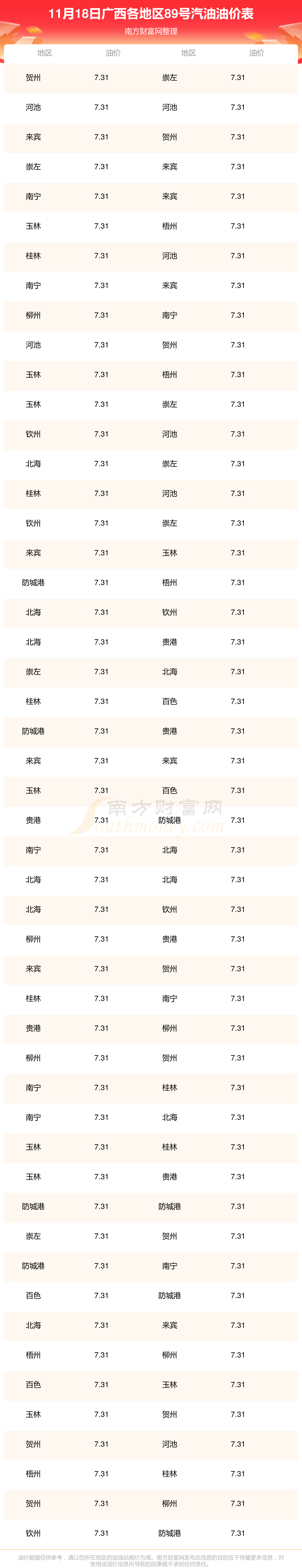 11月18日,广西89号汽油的价格是6.52元每升,本次的调整时间为11月11日,对比上次的调整上调了0.09元,上调1.4%,下次调整时间为11月24日24时,还有6.22天。