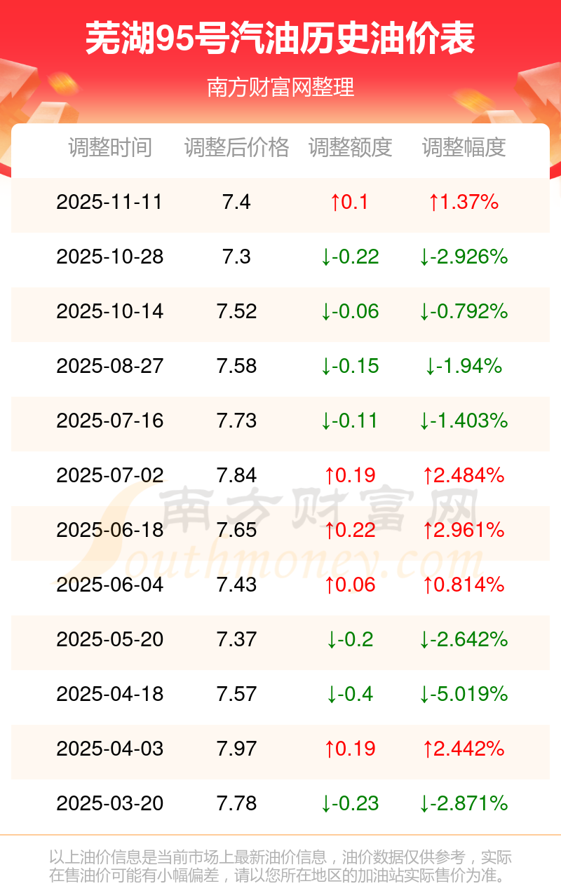 11月18日芜湖95号汽油的价格是7.4元/升(调整时间为11月11日),对比上次调整时间10月28日的油价7.3元/升,涨了0.1元,涨幅达1.37%。下一轮油价调整时间11月24日24时,距离现在还有6.21天。