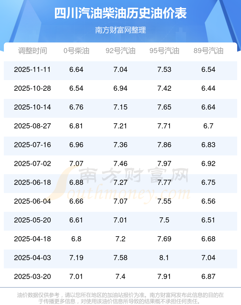 11月18日,四川0号柴油的价格是6.64元每升,本次的调整时间为11月11日,对比上次的调整增了0.1元,增1.529%,下次调整时间为11月24日24时,还有6.21天。