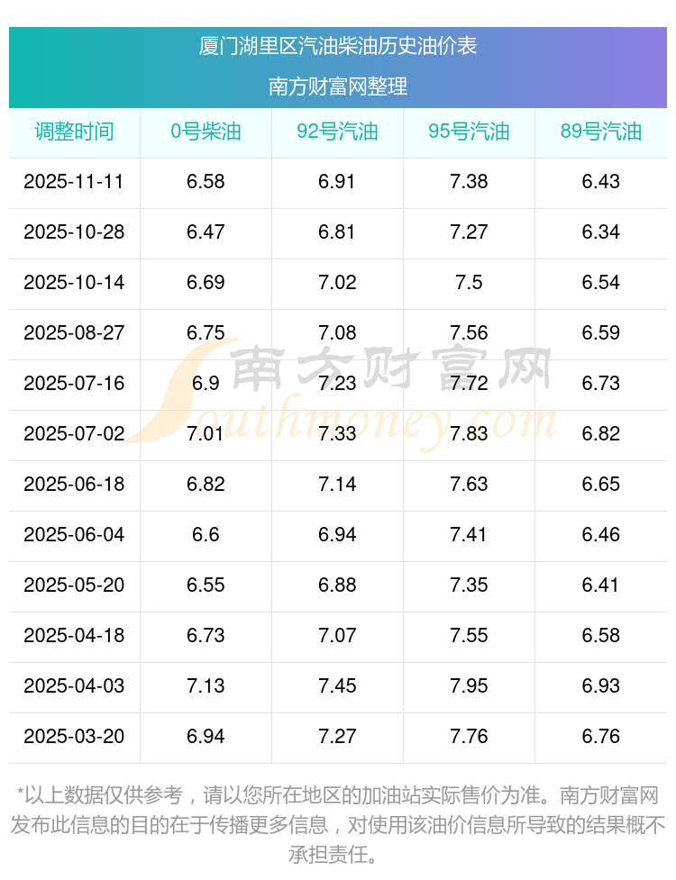 油价调整最新消息:下一轮油价调整时间11月24日24时。11月18日厦门湖里区汽油、柴油每升价格详情为:92号汽油为6.91元,涨了0.1元;95号汽油为7.38元,涨了0.11元;89号汽油为6.43元,涨了0.09元;0号柴油为6.58元,涨了0.11元,本次油价调整时间为11月11日。