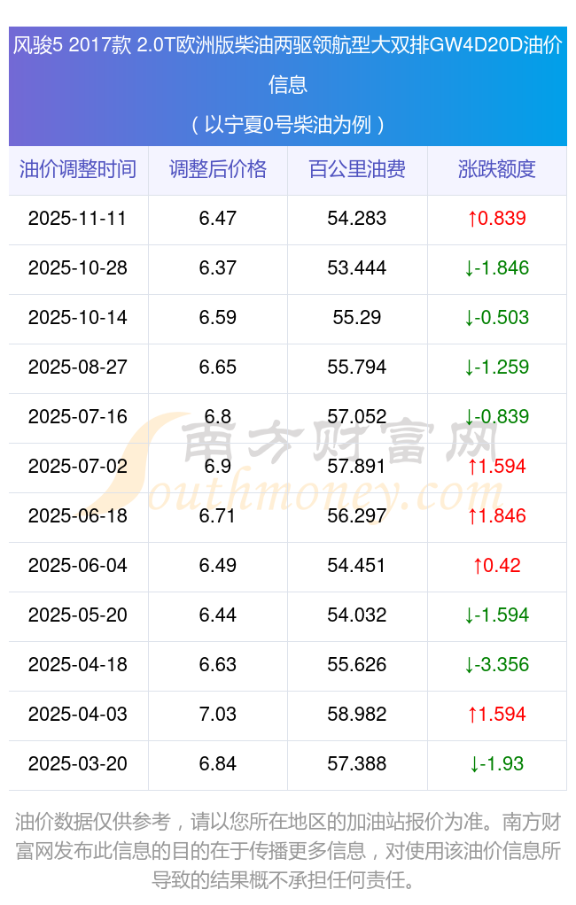 按照11月11日0号柴油最新调整价格6.47元/升来计算(以宁夏为例),该车型百公里平均油费为54.283元,按照上一轮10月28日调整价格6.37元/升来计算,百公里平均油费为53.444元,对比上一轮多花0.839元,下一轮油价调整时间为11月24日24时。