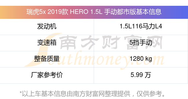 在动力上,瑞虎5x 2019款 HERO 1.5L 手动都市版配备的是一台1.5L116马力L4自然吸气发动机,匹配的是5挡手动挡变速箱,燃料形式为汽油,常规整备质量1280kg,厂家参考价5.99万元。