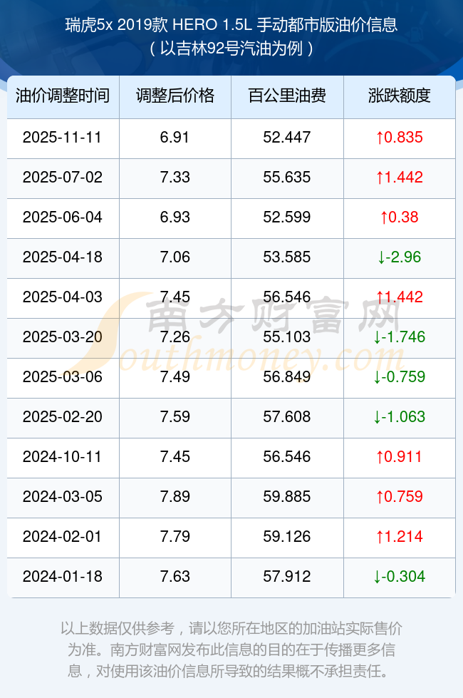 依照11月11日92号汽油最新调整价格6.91元/升来计算(以吉林为例),该车型百公里的平均油费是52.447元,依照上一轮7月2日调整价格6.8元/升来计算,百公里的平均油费是51.612元,对比上一轮多花0.835元,下一轮的油价调整时间11月24日24时。