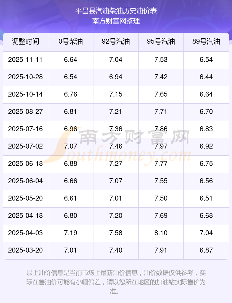 油价调整最新消息:下一轮油价调整时间11月24日24时。11月18日平昌县汽油柴油每升的价格为11月11日调整后的价格,具体如下:92号汽油7.04元;95号汽油7.53元;89号汽油6.54元;0号柴油6.64元。