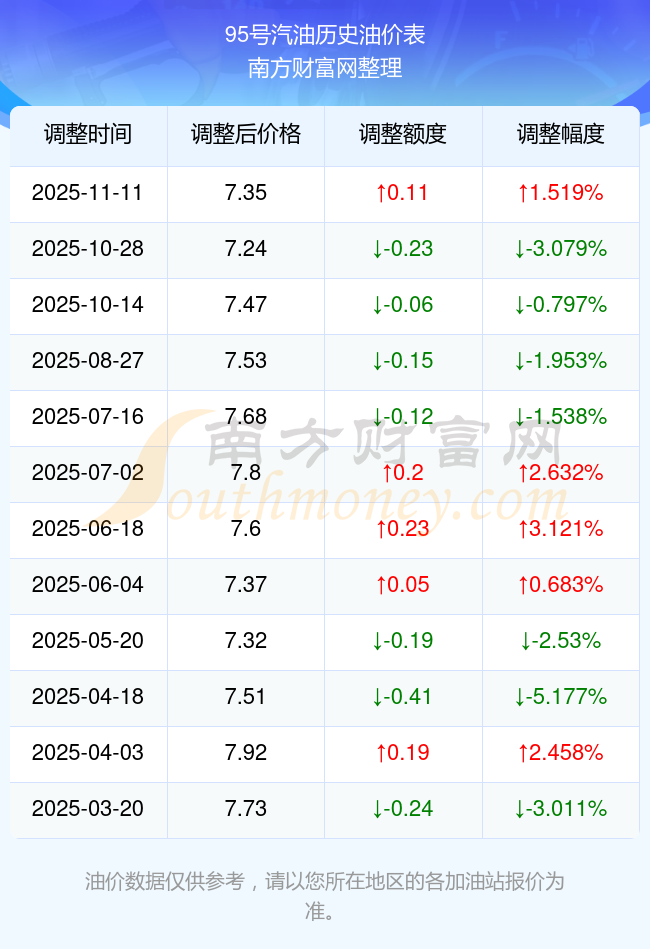 汽油价格调整最新消息:下一轮油价调整时间11月24日24时。11月18日上海汽油、柴油的价格为11月11日调整后的价格。每升最新价格为:92号汽油6.91元,增了0.1元;95号汽油7.35元,增了0.11元;89号汽油6.44元,增了0.09;0号柴油6.56元,增了0.11元。