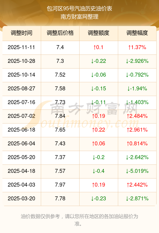11月18日包河区汽油柴油每升价格(11月11日调整后的价格):92号汽油为6.91元,上涨了0.1元,上涨幅达1.47%;95号汽油为7.4元,上涨了0.1元,上涨幅达1.37%;89号汽油为6.47元,上涨了0.1元,上涨幅达1.57%;0号柴油为6.61元,上涨了0.1元,上涨幅达1.54%。