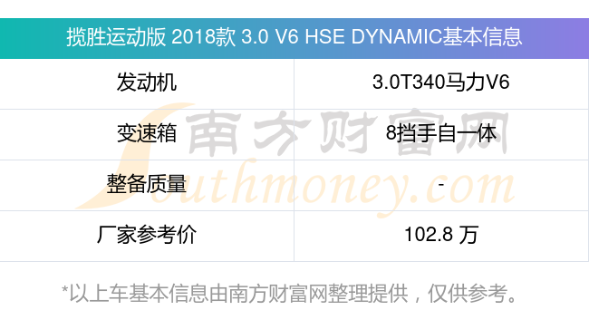在动力上,揽胜运动版 2018款 3.0 V6 HSE DYNAMIC配备的是一台3.0T340马力V6机械增压发动机,匹配的是8挡手自一体自动档变速箱,燃料形式为汽油,厂家参考价102.8万元。