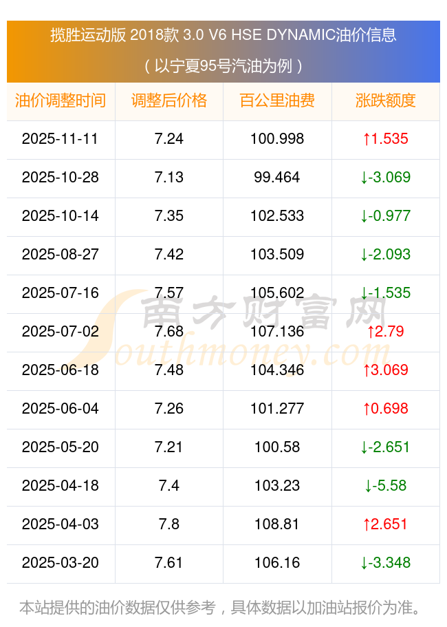 按照11月11日95号汽油最新调整价格7.24元/升来计算(以宁夏为例),该车型百公里平均油费为100.998元,按照上一轮10月28日调整价格7.13元/升来计算,百公里平均油费为99.464元,对比上一轮多花1.535元,下一轮油价调整时间为11月24日24时。