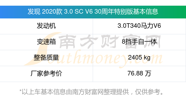 发现 2020款 3.0 SC V6 30周年特别版动力上搭载的是一台3.0T340马力V6机械增压发动机,匹配8挡手自一体自动档变速箱,燃料形式为汽油,常规整备质量2405kg,厂家参考价76.88万元。
