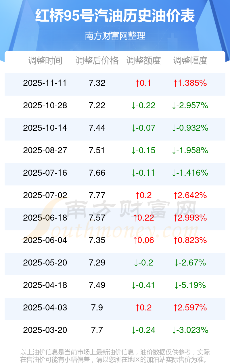 红桥95号汽油11月18日最新价格为7.32元/升,调整时间为11月11日,相对上次调整时间10月28日的油价7.22元每升,上涨了0.1元,上涨1.385%。下一轮油价调整时间11月24日24时,距离现在还有6.14天。